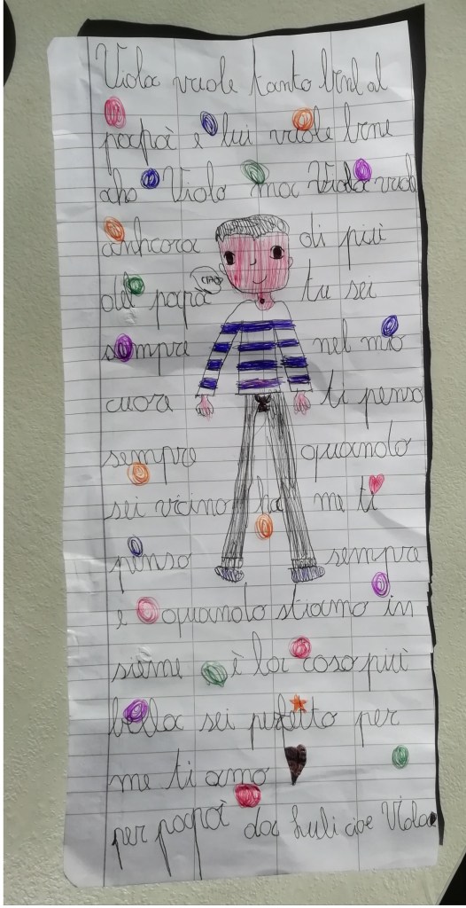 25 marzo 2020. Mercoledì. La quarantena si fa sentire come il vento alle finestre. Raschio il fondo delle idee e della pazienza dopo un match estenuante con Viola sul corretto approccio nell’utilizzo equilibrato del tempo di gioco e dei compiti. Non c’è pezza ha perso smalto e ritmo, sembra il Bonifazi rientrante dal periodo di inattività sotto la Mole. Rischia anche il rosso per un fallo (verbale) di reazione. Ma poi, come un gol di testa alla Roma (o alla Juve), si fa perdonare tutto mostrandomi l’opera personalizzata attaccata sul frigorifero. Mi aveva disegnato a righe biancoazzurre. Quella ruffiana della mia meravigliosa e sgrammaticata primogenita…